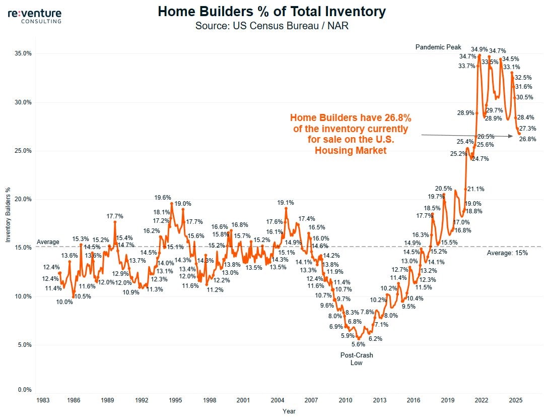 Outside the city, the story’s different. Builders across the country are cutting prices by double digits. In some regions, like Southern California and Florida, new construction prices are down 20–25% from their 2022 peaks.