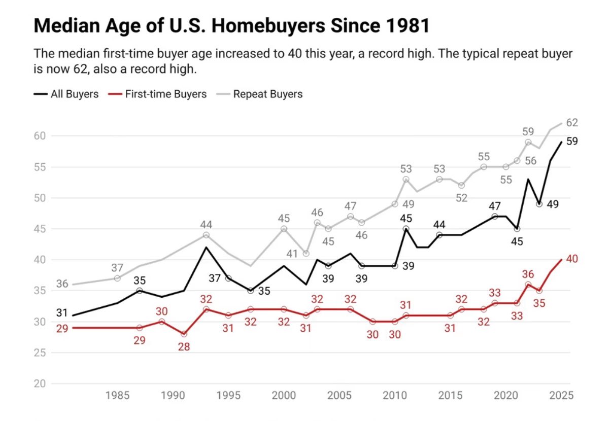 Here’s a stat worth repeating. The median age of a U.S. homebuyer is now 59, up from 39 in 2005. For first-time buyers, it’s 40. For repeat buyers, it’s 62.