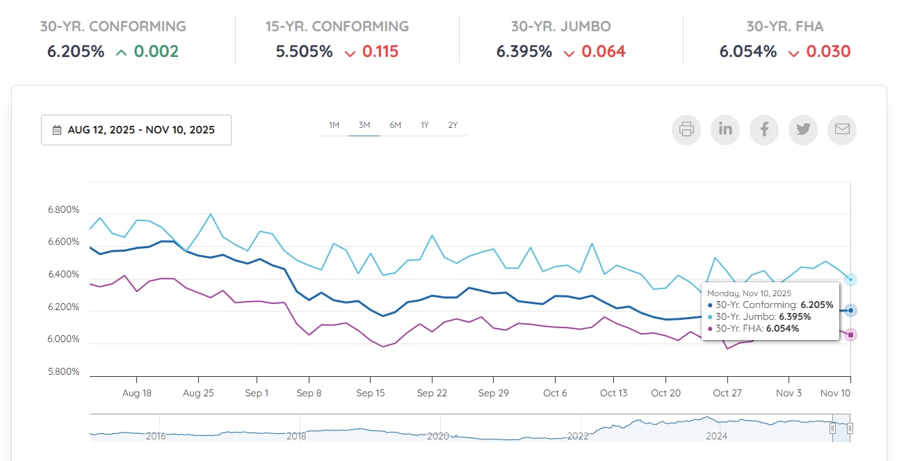 That subtle repricing has already nudged mortgage rates higher, even without a single Fed move. The 30-year fixed, which dipped toward the low sixes in October, has crept back up toward 6.5–6.7%, with jumbos still outperforming slightly.