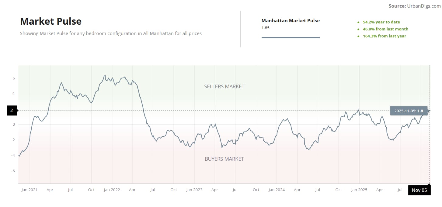 UrbanDigs’ Market Pulse—a ratio comparing deals to listings—has climbed into what looks like “seller territory.” But don’t be fooled by the chart shading. On closer inspection, Manhattan sits in a neutral-to-seller-biased zone, far from the peak leverage points of 2013–2015 or the pandemic rebound of 2021.