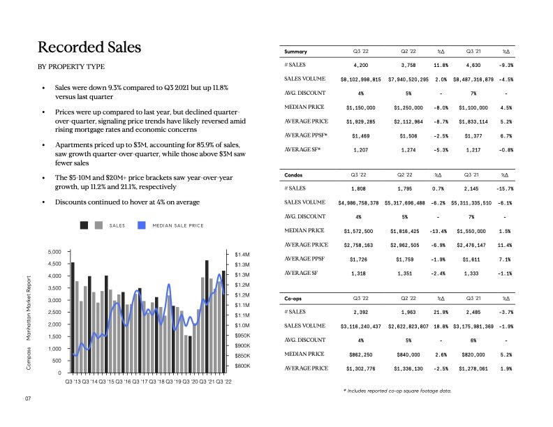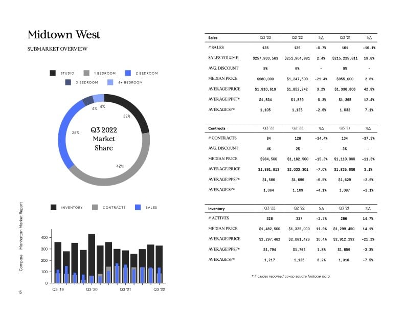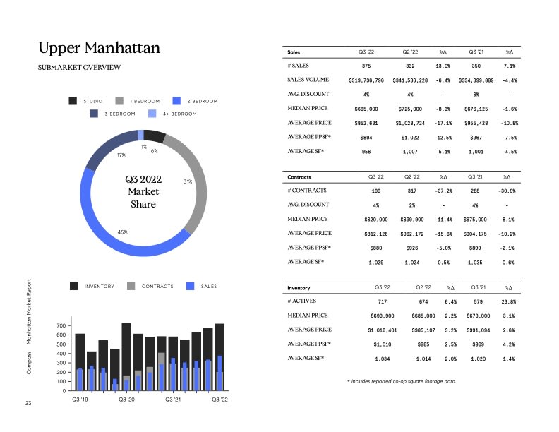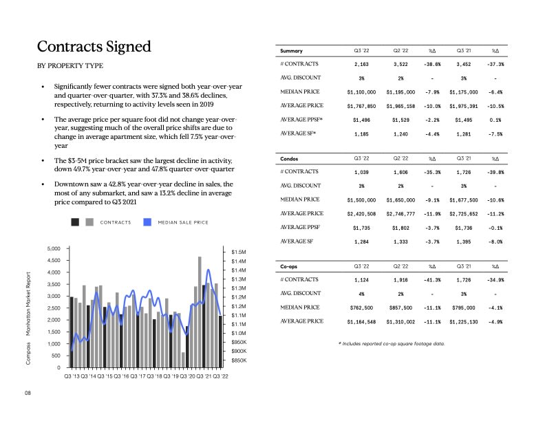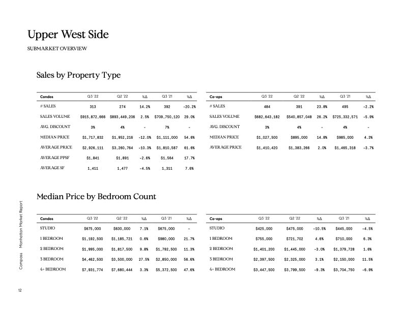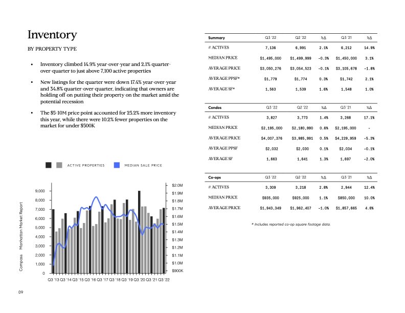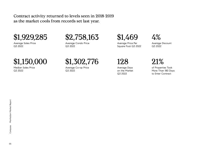 Condo prices averaged $2,758,163 in Q3 of 2022 and co-op prices averaged $1,302,776 during the same time period. These prices are both increases from Q2 of 2022. The average days on the market decreased slightly to 128 days in Q3 of 2022. The average discount increased to 4%. Out of all properties that went into contract in Q3 of 2022, 21% took more than 180 days to enter contract.