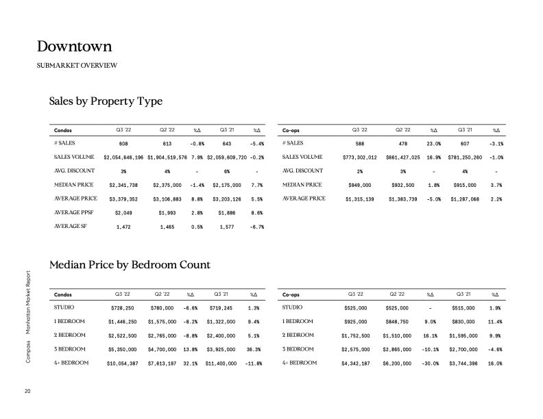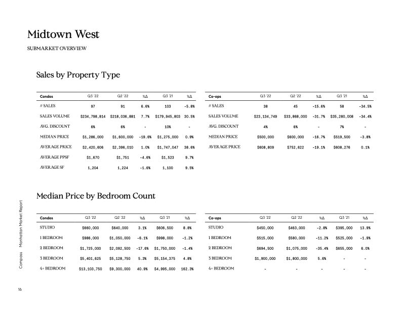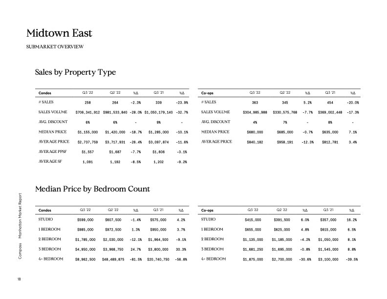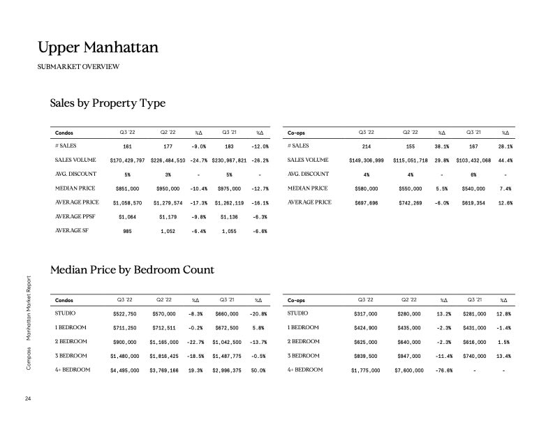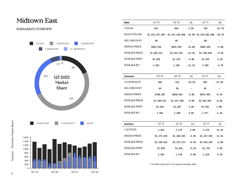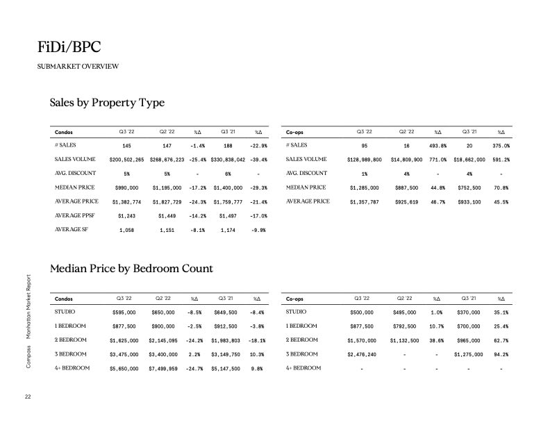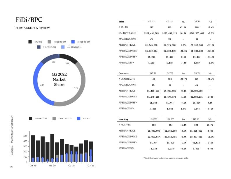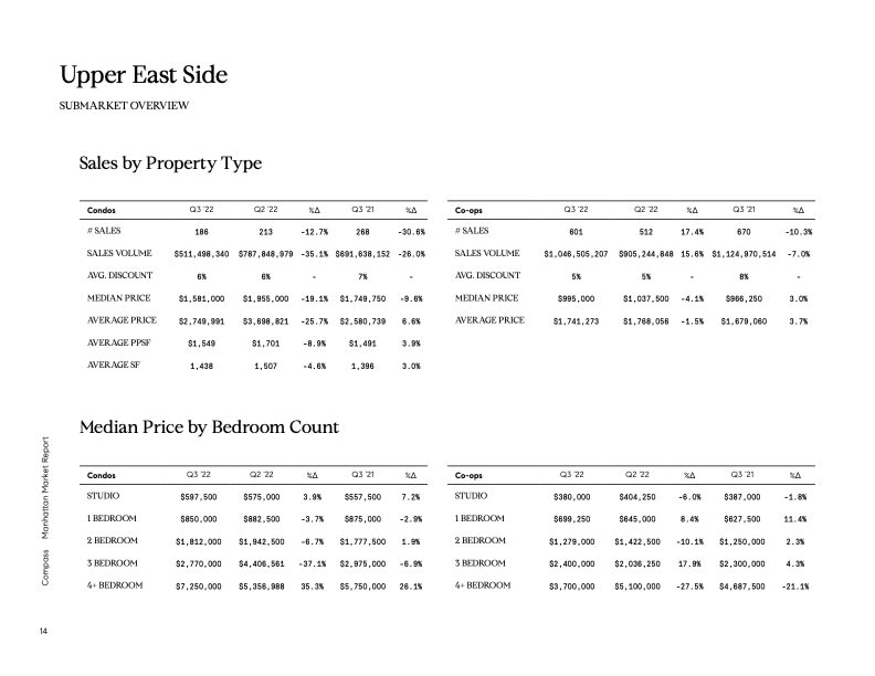 Condo prices averaged $2,758,163 in Q3 of 2022 and co-op prices averaged $1,302,776 during the same time period. These prices are both increases from Q2 of 2022. The average days on the market decreased slightly to 128 days in Q3 of 2022. The average discount increased to 4%. Out of all properties that went into contract in Q3 of 2022, 21% took more than 180 days to enter contract.
