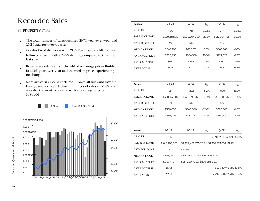 According to recent data, the average sale price in Queens closed at $690,373, representing a 2.3 percent increase year-over-year. This data is impacted by house sales, which constitute 56.9 percent of total transactions and have an average price of $935,709. However, those sensitive to higher mortgage rates can find unprecedented value in the co-op market in Queens, with buyers paying an average of $370,372.