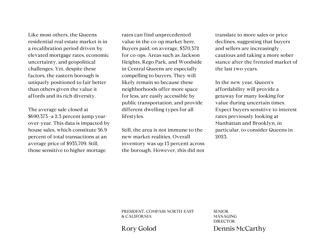 As we move into the new year, Queens' affordability will provide a welcome refuge for many looking for value during uncertain times. Expect buyers who were previously looking at Manhattan and Brooklyn in particular, to consider Queens in 2023. With the value it offers and rich diversity, Queens is the perfect place for those looking for a home in the city that offers it all.