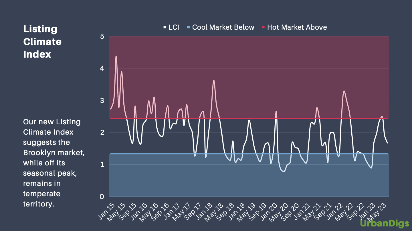 Their shiny, freshly baked Listing Climate Index is a ratio of contracts signed (the success!) to off-market data (the failure, ouch!). This index suggests that it's becoming increasingly challenging to successfully list in Brooklyn, though not as daunting as in Manhattan. But no worries, Brooklyn is tougher than it looks, and it's showing signs of settling right around the average July line.