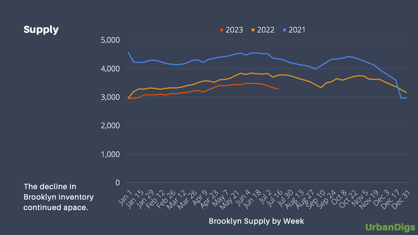 On this Friday afternoon, we see some interesting trends in Brooklyn. The overall supply is slightly decreasing, at 3,283 listings, an expected summertime trend we've seen in past years. It looks like Brooklyn's real estate market is enjoying a little siesta.