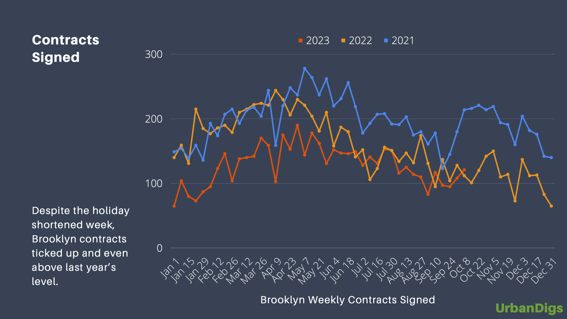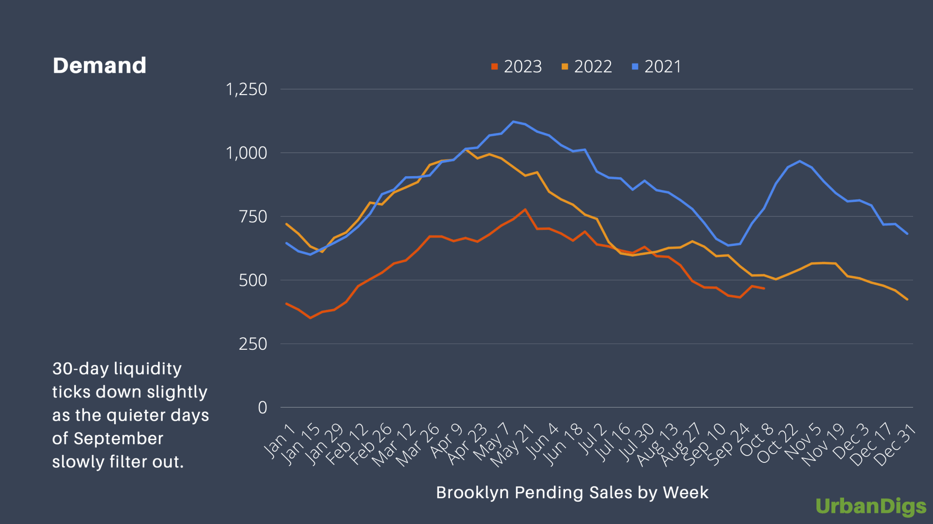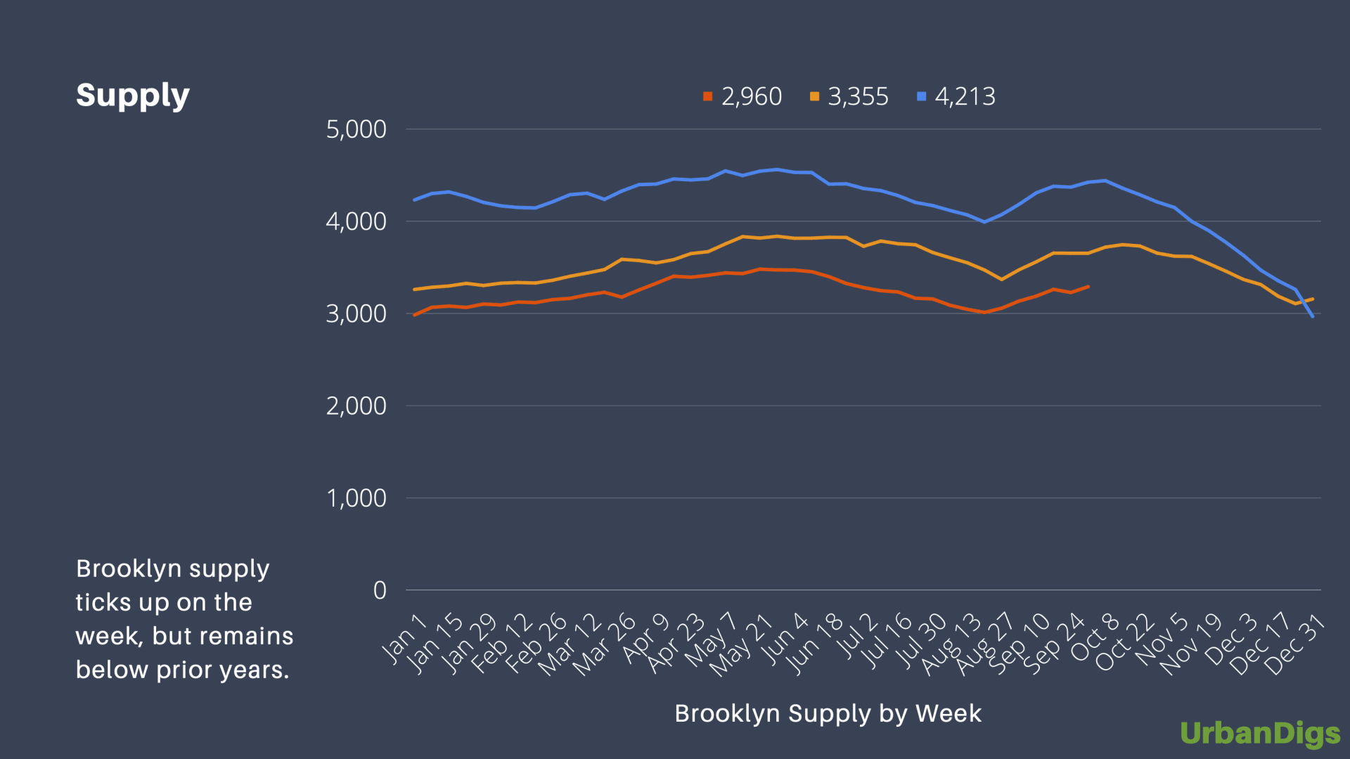 - Despite a 2% increase last week, Brooklyn's real estate market supply is still shy of previous figures. The market remains tight, with little desperation from sellers to put their properties up for sale.