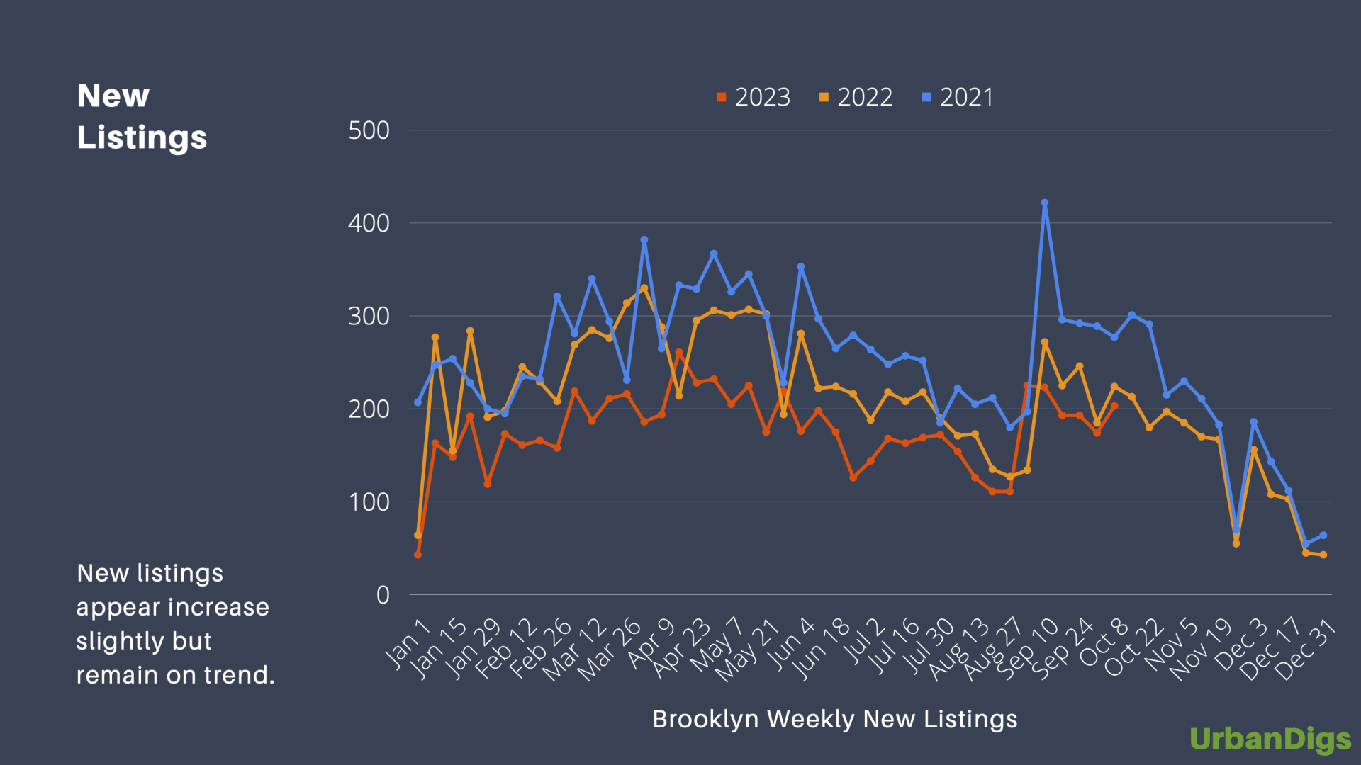 Speaking of forecasts, the Weeklies have thrown some interesting bones our way. A 14% surge in new listings popped up like an eagerly awaited plot twist amidst our weekly numbers – 103, to be precise. It's fair to say that the lower-than-usual numbers (even these inflated figures don't touch last year's highs) are a compelling whisper of the stars aligning just right for Brooklyn's cautious sellers.