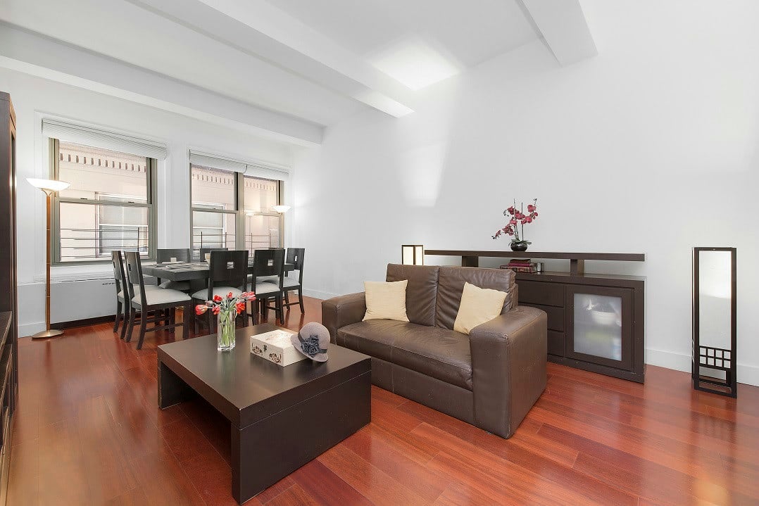 Come home to this extraordinary split 2 bedroom / 2 bath loft-style CONDO in the heart of the Financial District. The top of the line open kitchen features Sub Zero and Bosch appliances. Soaring 10'8" beamed ceilings and 7 windows make this home feel extra spacious, light and airy. The master bath is en-suite and the Brazilian cherry floors add a special warmth to the home. Two washers and two dryers are on the floor. The Fulton Street subway entrance and 24 hour supermarket are right across the street. Every convenience shopping necessity lies within a single block. Live in the heart of FiDi and take advantage of the neighborhoods transformation; there is over 2MM sf of new retail and lots of celebrity chefs set to open in the neighborhood over the next few months.